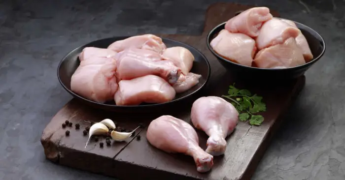 ظهور لحم الدجاج بحالته النيئة قد يرمز إلى العقبات والصعوبات النفسية التي يعاني منها الرائي، خاصة تلك المتعلقة بعلاقاته مع النساء. فمثلاً، إذا حلم شخص بتقطيع دجاج نيء، فقد يشير ذلك إلى المخاطرة التي يقدم عليها في سبيل تحقيق رغباته، حتى لو كان ذلك قد يلحق الضرر بسمعته. الصعوبة في الابتعاد عن التوترات النفسية قد تظهر أيضاً كلحم دجاج نيئ قد تم تقطيعه لكنه لا يزال مصدر قلق.